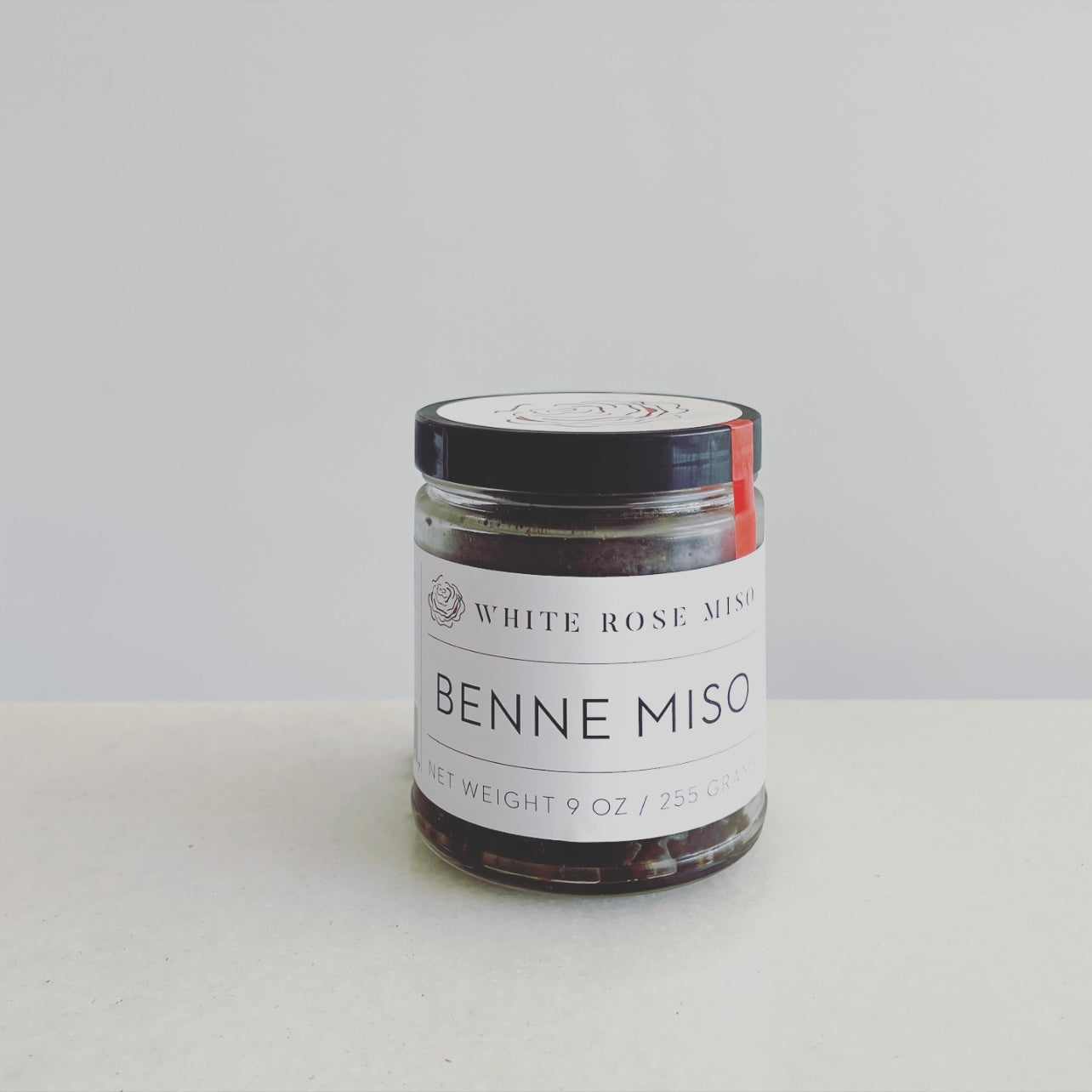 Benne seeds are a heritage variety of sesame, smaller & less oily. White Rose toasts the benne seeds until they are very dark, at which point they’ve taken on a bit of toasty char. The resulting miso is rich with nutty grilled flavor, balanced with a little sweetness from the koji. This miso is crying out for a little fat – try whipping into a compound butter to use on just about everything. The miso also works very well with a lot of Middle Eastern cuisine, in recipes that rely on tahini; garnish or puree into a hummus, baba ganoush, or similar dip. 9oz jar; water, organic emmer farro, benne seed, salt, koji. *Contains wheat and sesame*