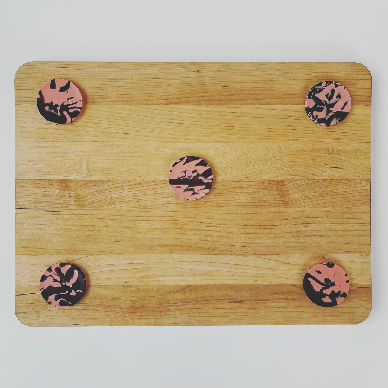 Bye bye, damp towel, your time has passed! We are proud to present a less gross and much more sustainable solution to keeping your cutting board from slipping around your work surface while in the midst of preparations. These silicone feet are 100% post-consumer recycled silicone, fully food-safe, endlessly reusable and easy to clean. They come in a set of five, one for each corner and one in the middle, between the working surface and underside of your cutting board, regardless of material, for a safe and secure placement. Three colorways: pink & black swirl, green & yellow swirl, and solid black; each with a laser etched ACCOUTRE logo on the flat side.