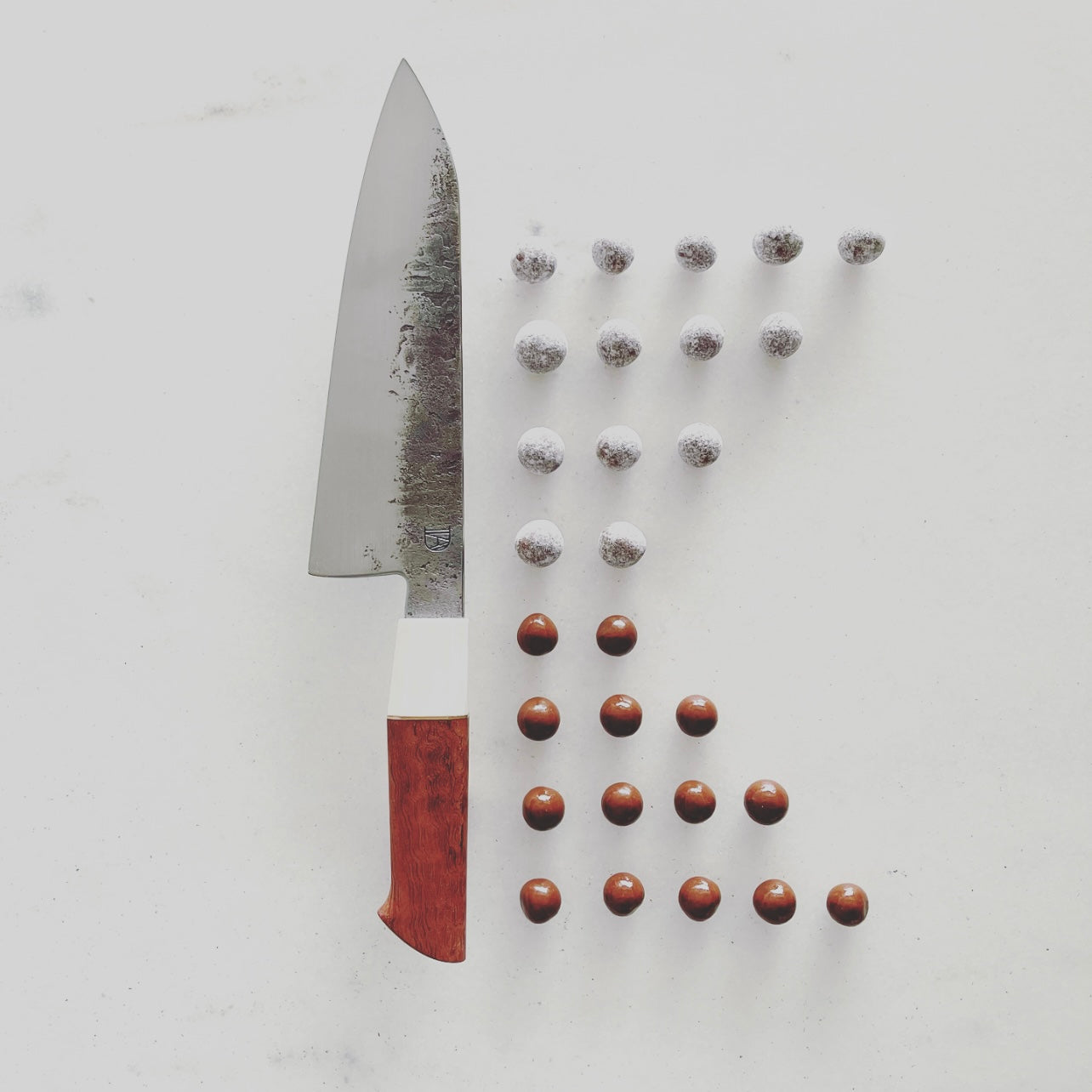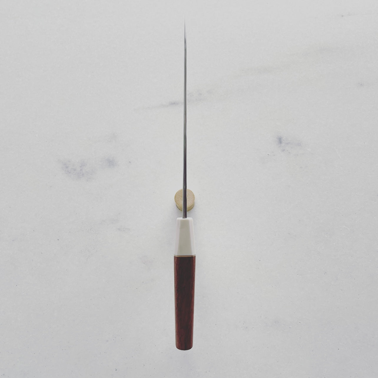 A markedly Western take on the traditional Japanese all-rounder, the santoku. Taller longer than some, Dylan brings forth this condensed version of a chef's knife with plenty of pointed intuition throughout. 190mm cruforge-v high carbon steel for excellent edge retention and hardness and a mixed bag of attributes in the handle work, with both smooth and angular facets that fit the hand effortlessly. Materials complementing the steel are bubinga, elforyn (faux ivory), and a subtle brass inlay. Meat, fish, vegetables? Chop, slice, dice? YES to all. Handcrafted in Chicago, IL.