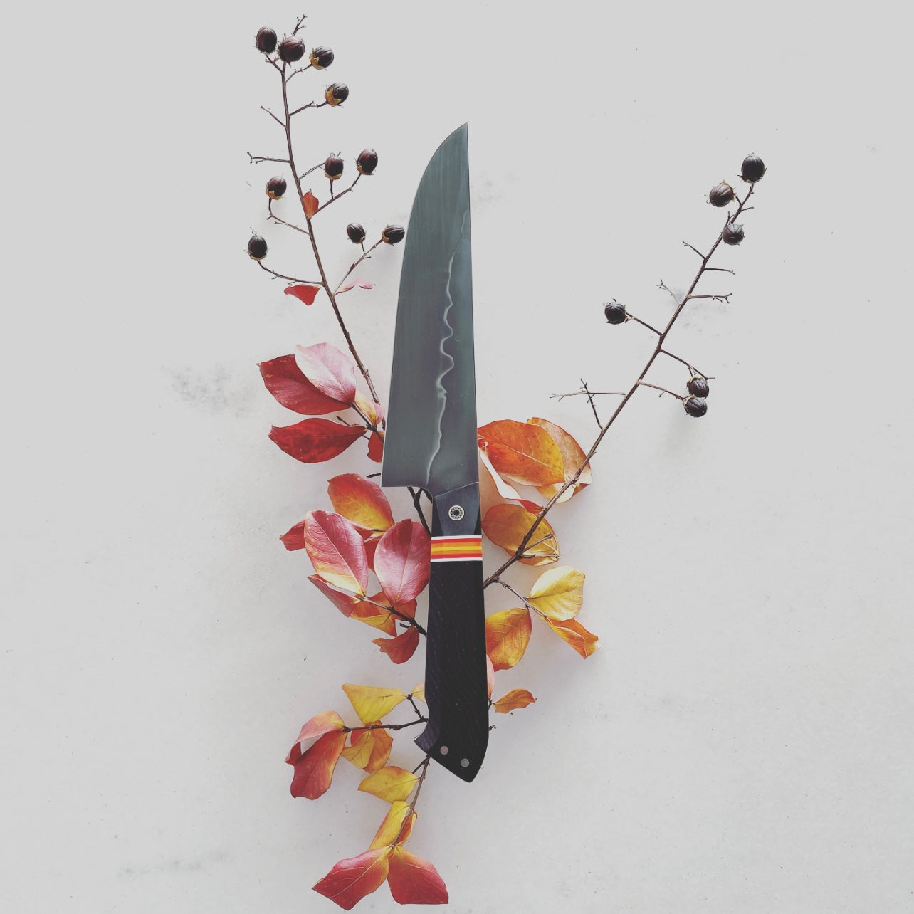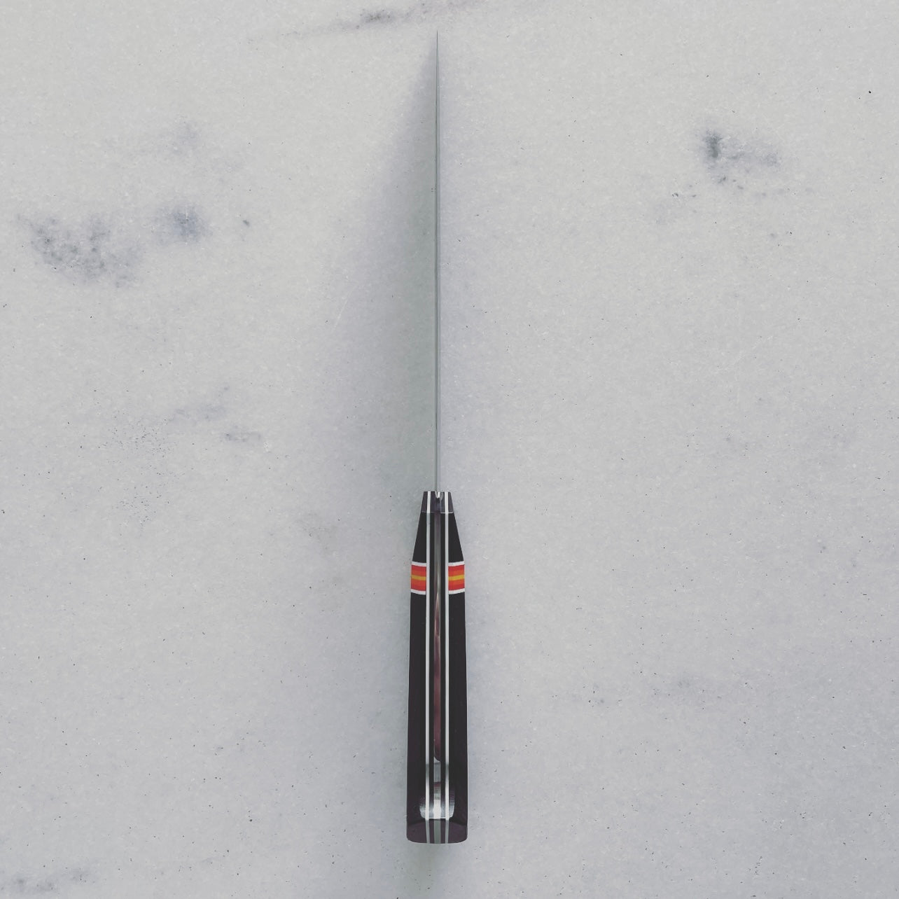 Lil bit longer, lil bit taller than most traditional petty geometries out there, which is great for its ability to creep into task work that requires a little more gusto. Super rigid through the spine with just enough flex at the uniquely up-angled tip to get into some of that sub-primal breakdown. 178mm, full tang W2 high carbon steel with a nice and thick handle of U.S. ancient bog oak, cascading colored G10 liners and RichLite. Handcrafted in Richmond, VA. You better scoop this up before I do!