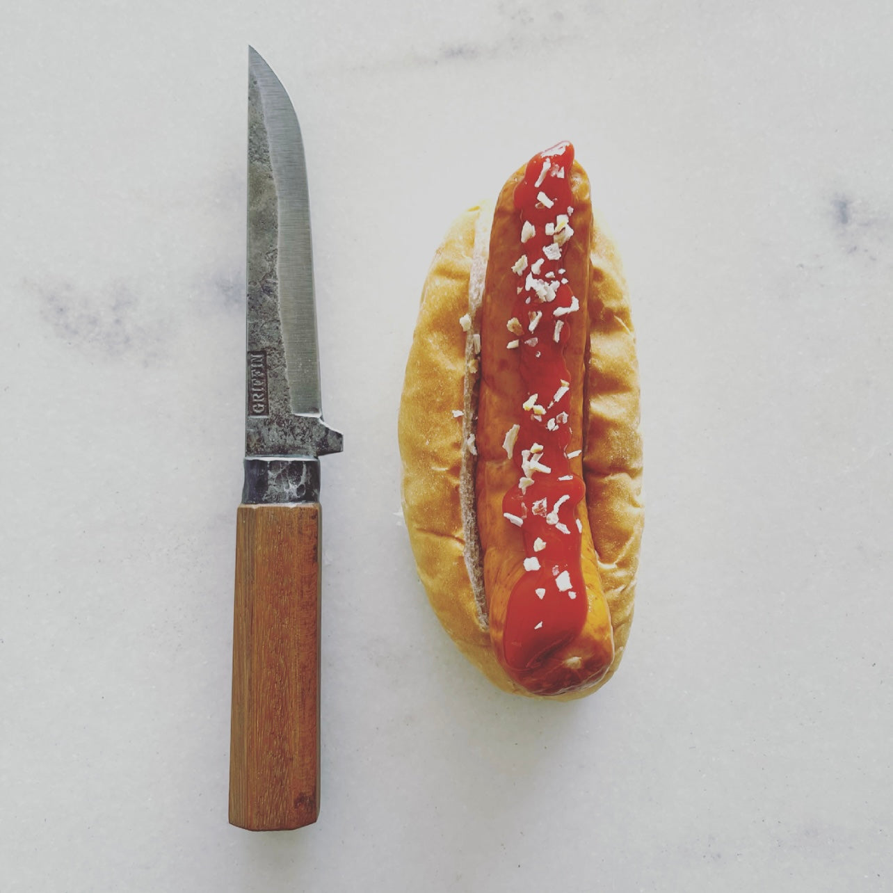 An excellently crafted knife for general purpose animal breakdown. This 115mm stunner is a cross between a Western style butcher's knife and a Japanese hankotsu, making it well-suited for a variety of different hand grasps an most certainly adept at tackling all major proteins- poultry included- within a whole-animal approach (primal, sub-primal and secondary cuts alike). The edge steel is forged 52100 high carbon with a soft steel ferrule and the octagonal wa handle is reclaimed teak from a Japanese schooner. It also comes with a leather sheath that was crafted by Will Griffin himself! This one checks all the boxes for the meat enthusiast! Handcrafted in Brooklyn, NY.