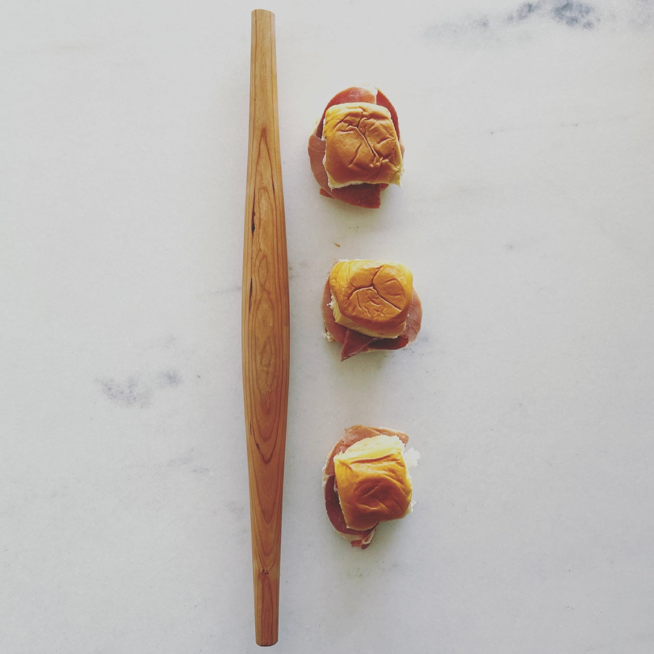 An intuitive riff on the iconic French style rolling pin that creates a growing diameter from one end toward the center and then declines into the other end. This one, turned by hand from Will Griffin is a little more narrow for added maneuverability and handles smaller format applications as well as larger tasks. Each piece of cherry is approximately 21" in length with end diameters of ø.75" and a center diameter of ø1.6". Handcrafted in Brooklyn, NYC.