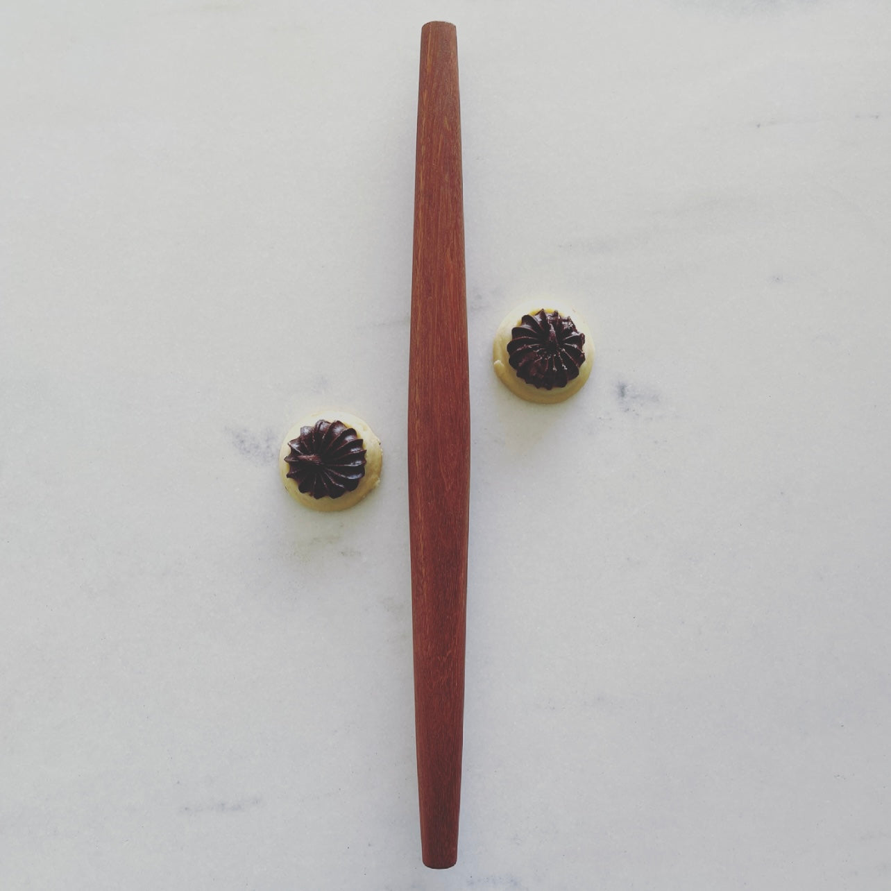 An intuitive riff on the iconic French style rolling pin that creates a growing diameter from one end toward the center and then declines into the other end. This one, turned by hand from Will Griffin is a little more narrow for added maneuverability and handles smaller format applications as well as larger tasks. Each piece of reclaimed mahogany is approximately 21" in length with end diameters of ø.75" and a center diameter of ø1.6". Handcrafted in Brooklyn, NYC.
