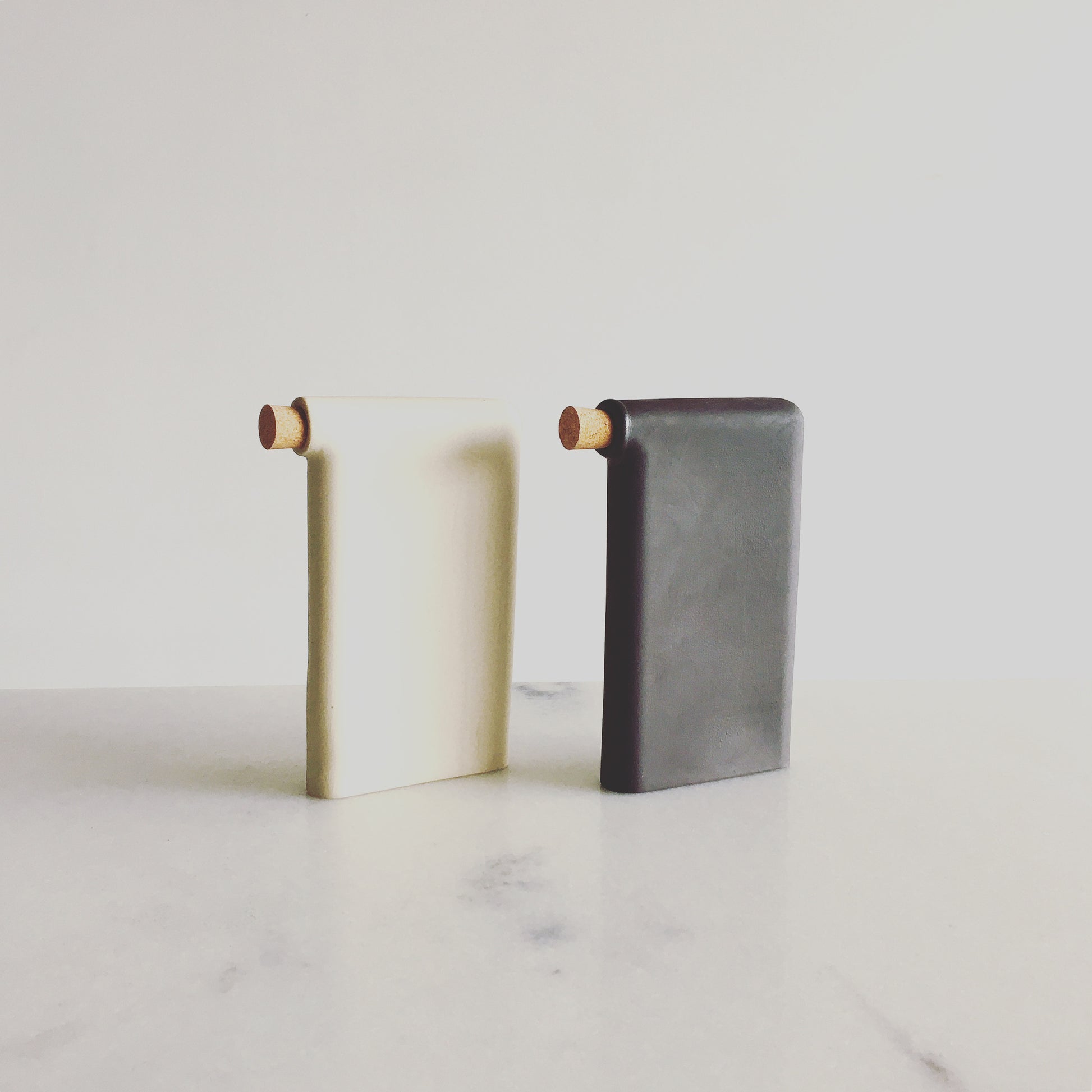 Thin, square-ish vessel for storing liquids of choice (oil, vinegar, spirits). Small cork keeps things fresh within the porcelain body. Approximately 2.5" x 1" x 4.5", and can hold about 4oz. Each one comes with a tiny funnel for ease of filling. Handcrafted in Poland.